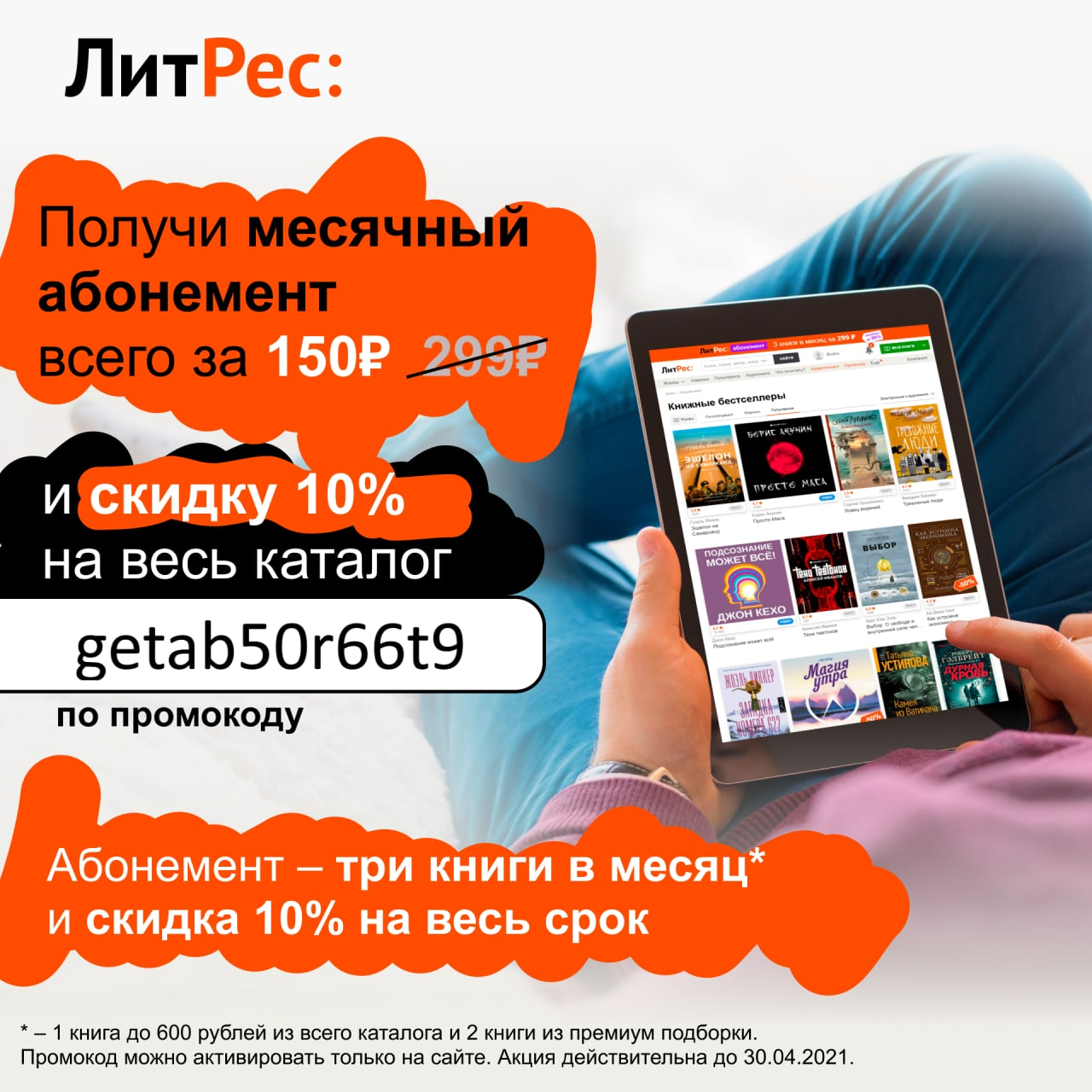 Переходим на сайт ЛитРес и вводим промокод: getab50r66t9.