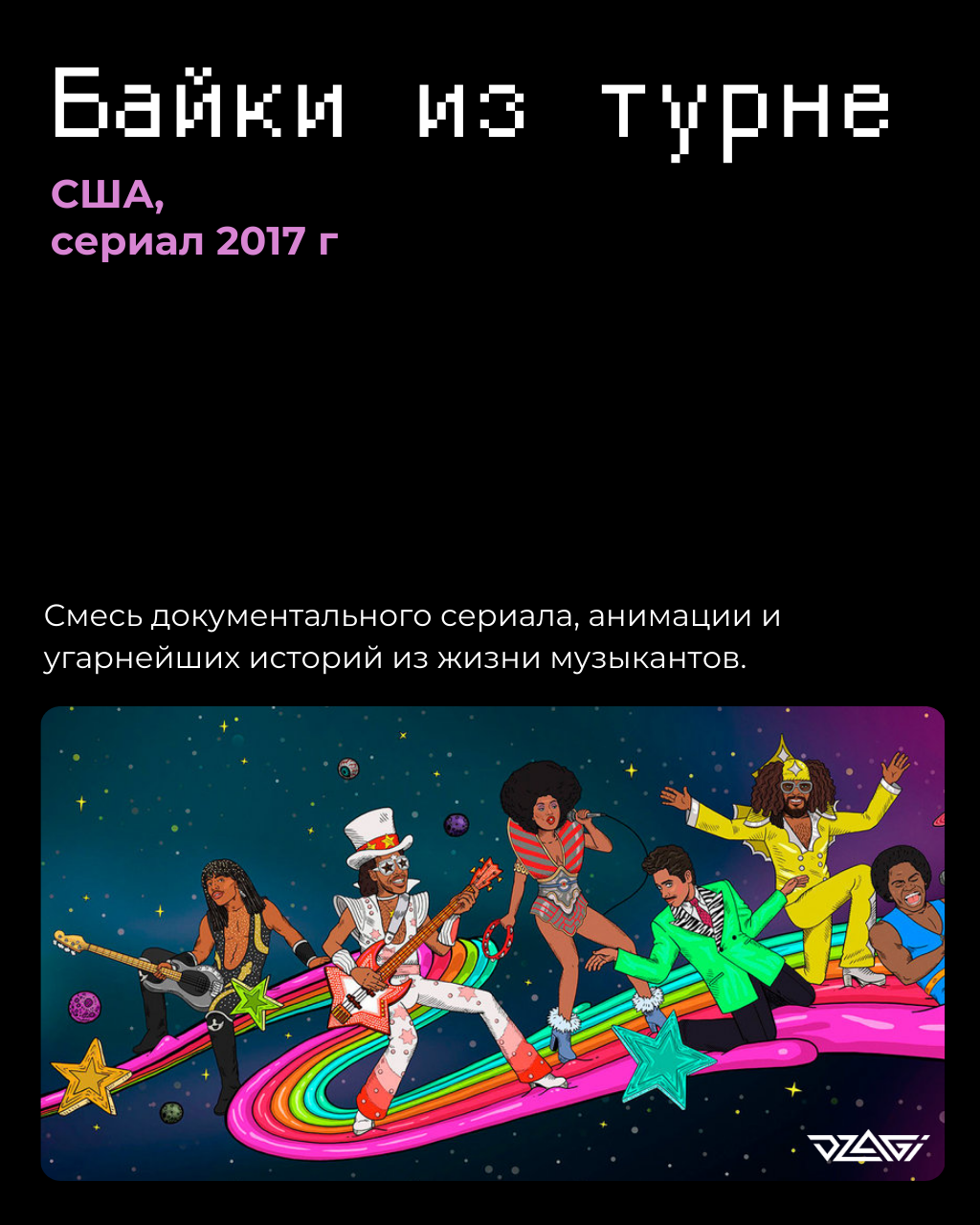 Майк Джадж когда-то создал «Бивиса и Баттхеда», потом подарил миру «Царя Горы», затем снял шикарный сериал про мир IT «Кремниевая Долина», а лет семь назад он сделал небольшой сериал «Байки из Турне», где решил в анимационном стиле рассказать байки из жизни разных музыкантов. Первый сезон посвящен исполнителям кантри, второй – звёздам фанка. И те, и другие дудели как паровозы, так что истории соответствующие.