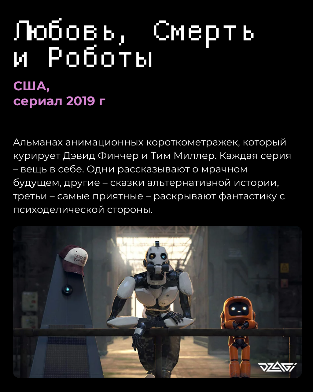 Вы наверняка могли слышать про «Любовь, Смерть и Роботы»: это довольно-таки нашумевший проект Netflix, который был запущен пять лет назад. Каждый из трёх сезонов представляет собой сборник нескольких короткометражек, которые длятся от пяти минут до получаса. У каждой – свой режиссёр и команда аниматоров. Некоторые из этих микрофильмов – киберпанк, другие – фэнтези, третьи – ужасы, четвёртые вообще, скорее, уходят в комедию. Но все очень интересные! Всё это безобразие курируют мастер триллера Дэвид Финчер («Бойцовский Клуб», «Семь», «Зодиак») и Тим Миллер (режиссёр «Дэдпула» и продюсер игры «Mass Effect 2»).