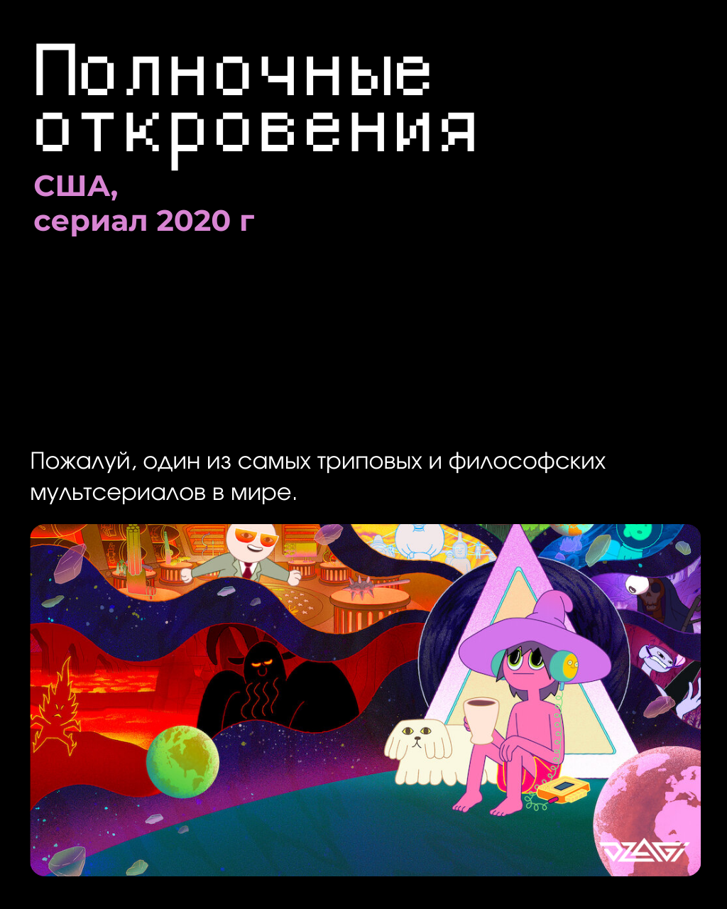 Яркие цвета, глубокие темы, постоянный диалог, психоделическая анимация и постоянное переключение фокуса внимания с аудио на видео и обратно – вот что такое «Полночные Откровения». Его создали Пендлтон Уорд, придумавший культовый сериал «Время Приключений», и Дункан Трассел, стендап-комик, частый гость подкаста Джо Рогана и автор своего собственного довольно философского шоу.