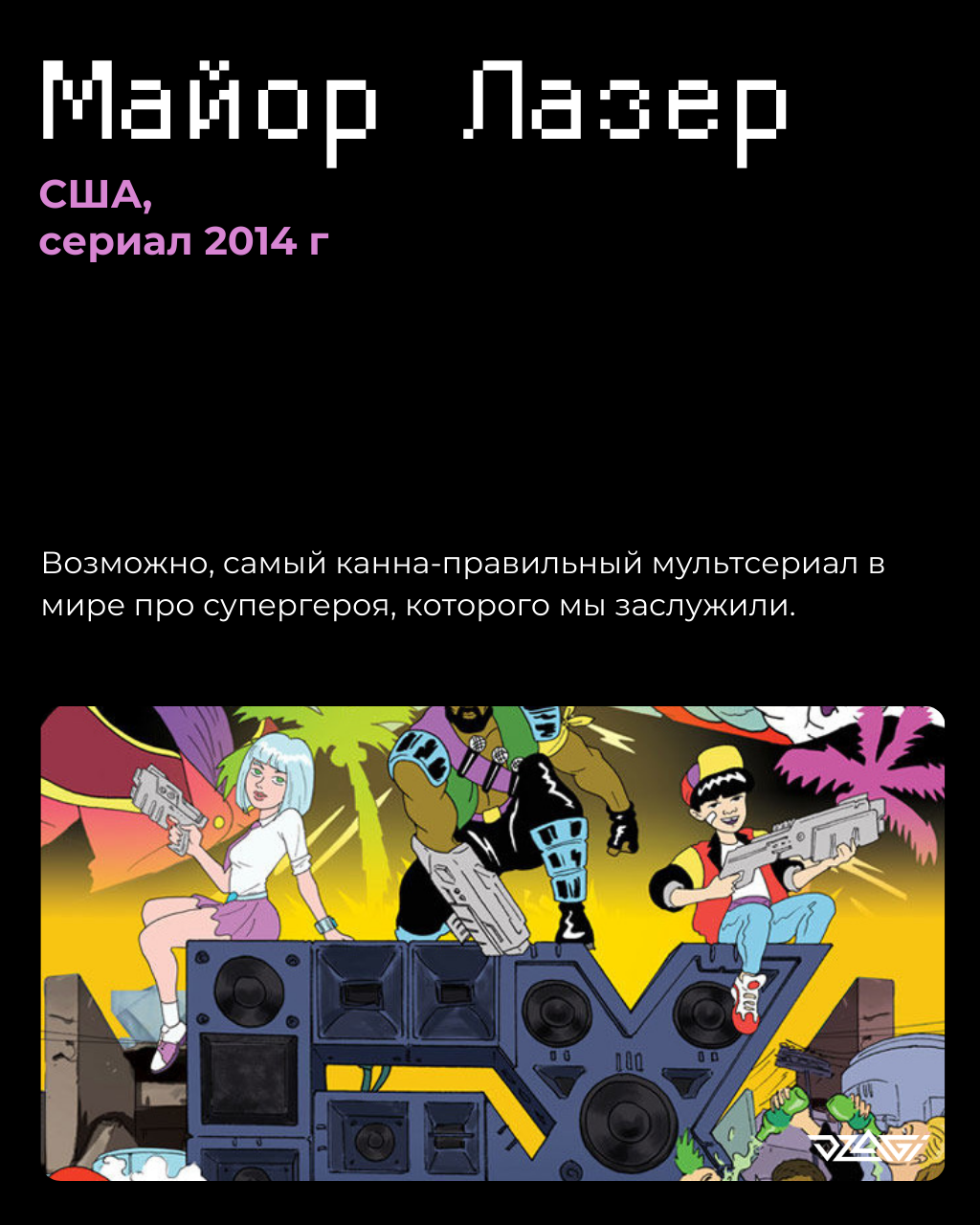 Майор Лазер (а в альтернативном прочтении – Главный Лентяй) – это ямайский супергерой с лазером вместо правой руки и с туго забитым пакетом шишек. Ну не об этом ли мы все мечтали? Первая же 10-минутная серия мгновенно погружает в контекст сериала: девочка Пенни решает дунуть первый раз и её накуривает так, что у неё случается бэд-трип. Звучит как работа на Майора Лазера! Скурить противника, вернуть басы в микс, одолеть вампиров – Лазеру всё по плечу. Особенно с вашей дымной поддержкой по другую сторону экрана.