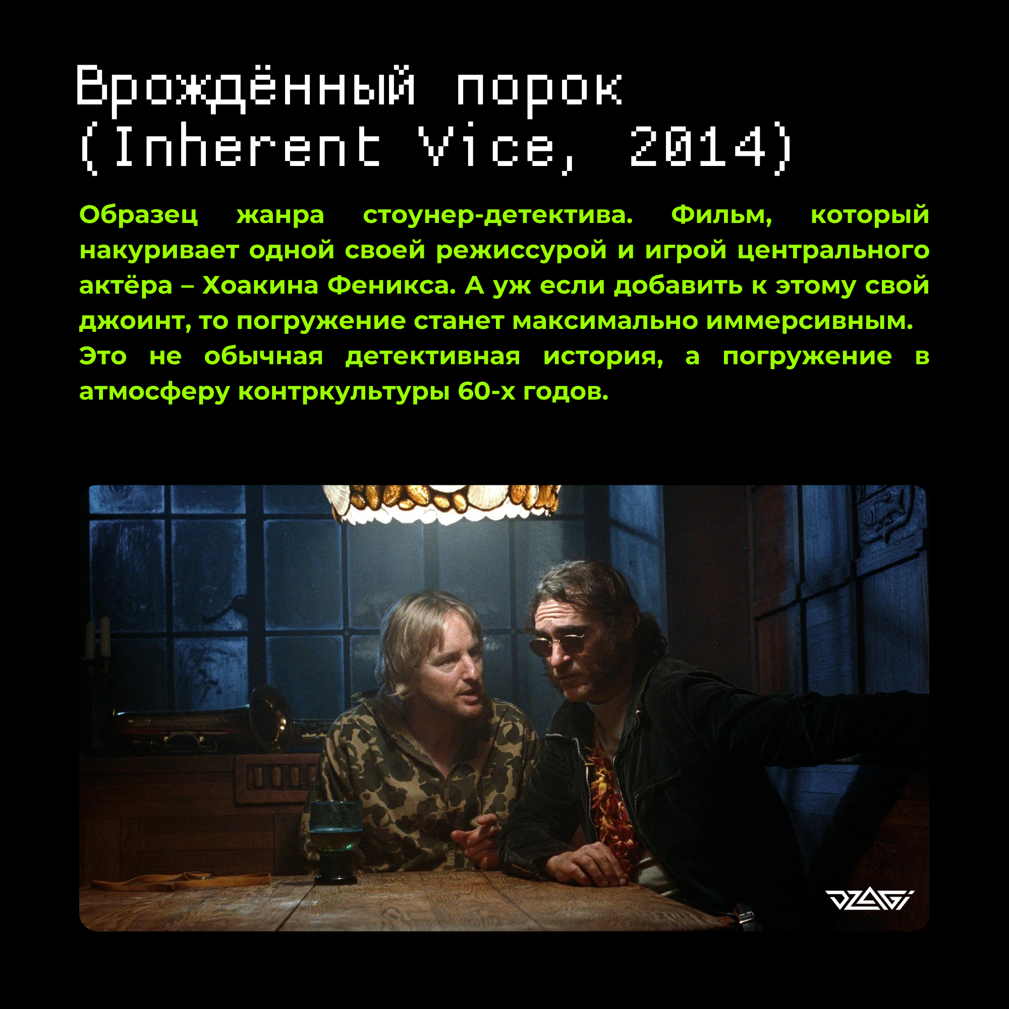 Начать подборку накуренного неонуара хочется с фильма, где сам главный герой – накуренный детектив. Его блестяще играет Хоакин Феникс.