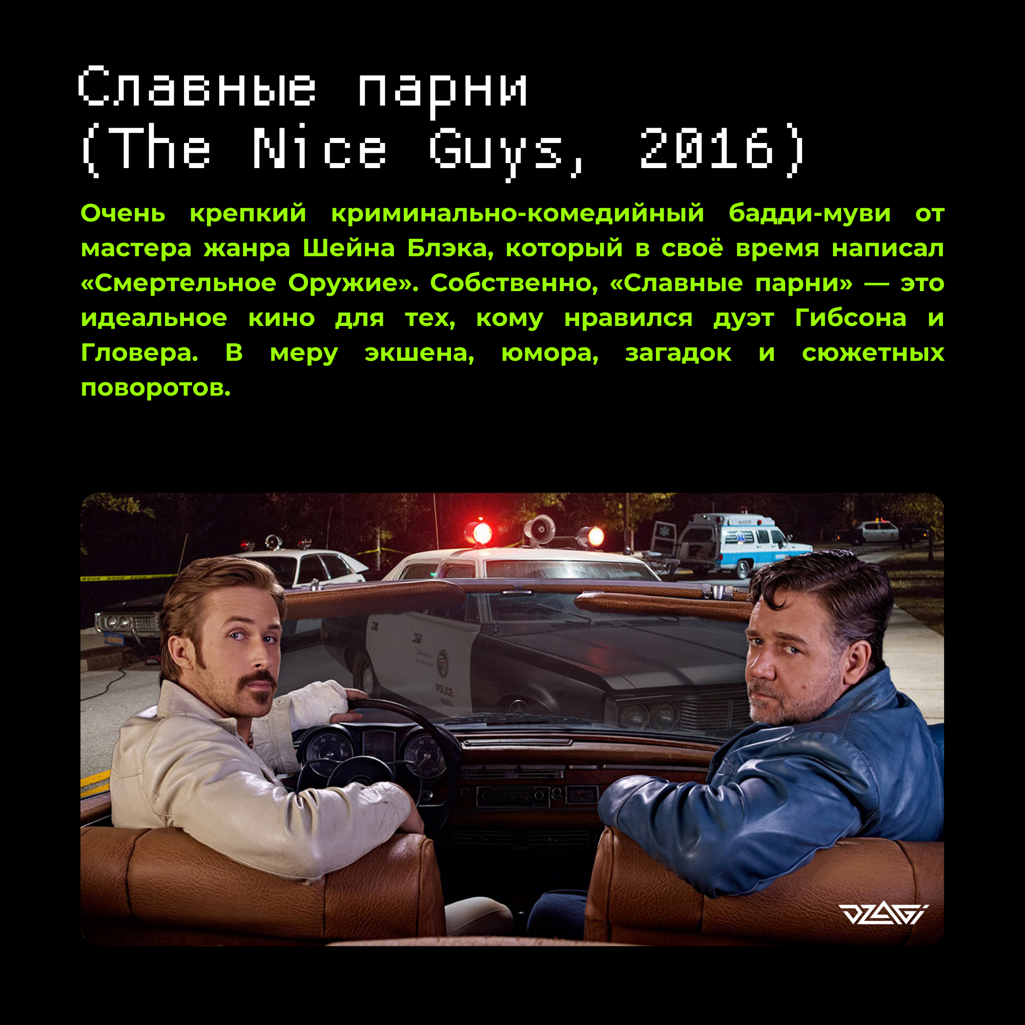 Гроверское сообщество DzagiНовая подборка фильмов от Dzagi идёт в абсолютный разрез с солнечной летней погодой. А всё потому что в этот раз мы собрали для вас небольшую коллекцию шикарных комедийных детективов. Все они подходят под определение неонуара.