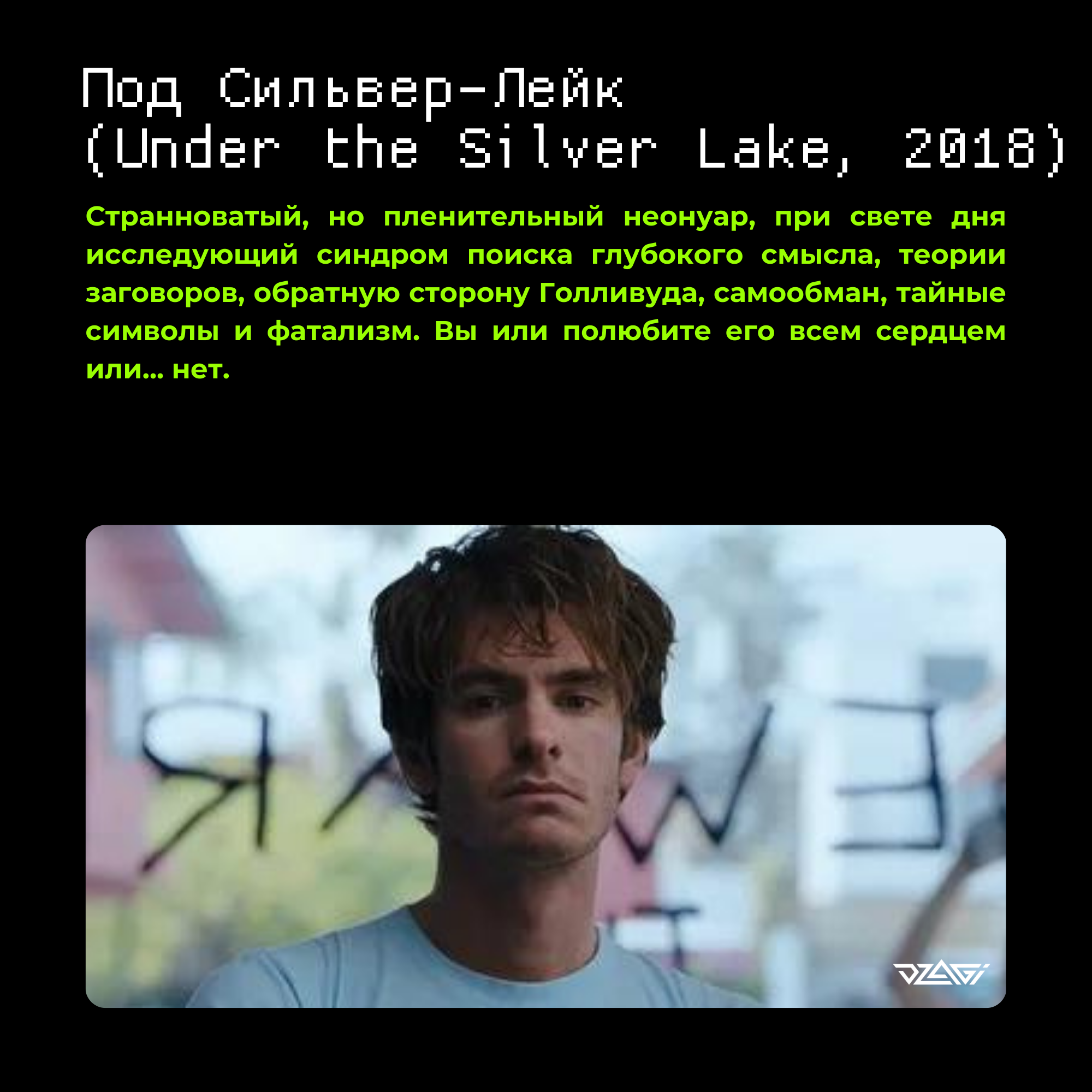 Вообще «Под Сильвер-Лейк» — это буквально гимн конспирологии. Главную роль тут исполнил Эндрю Гарфилд, который прекрасно передал образ слегка потерянного, но упорного (а порой и упоротого) Сэма, который везде ищет шифры и ключи. И находит! Картина эта интересна ещё и тем, что, во-первых, она отличается стильной визуальной эстетикой, во-вторых, сложным повествованием. А в-третьих, тут действительно по всему фильму разбросаны тайные послания, которые проявляют себя на второй-третий просмотр. Одни из них проливают свет на определённые сюжетные ветки фильма. Другие — ведут в никуда. А третьи ещё попросту не найдены: Дэвид Роберт Митчелл признался, что спрятал по всему фильму столько «пасхалок», что часть из них не раскрыта до сих пор.