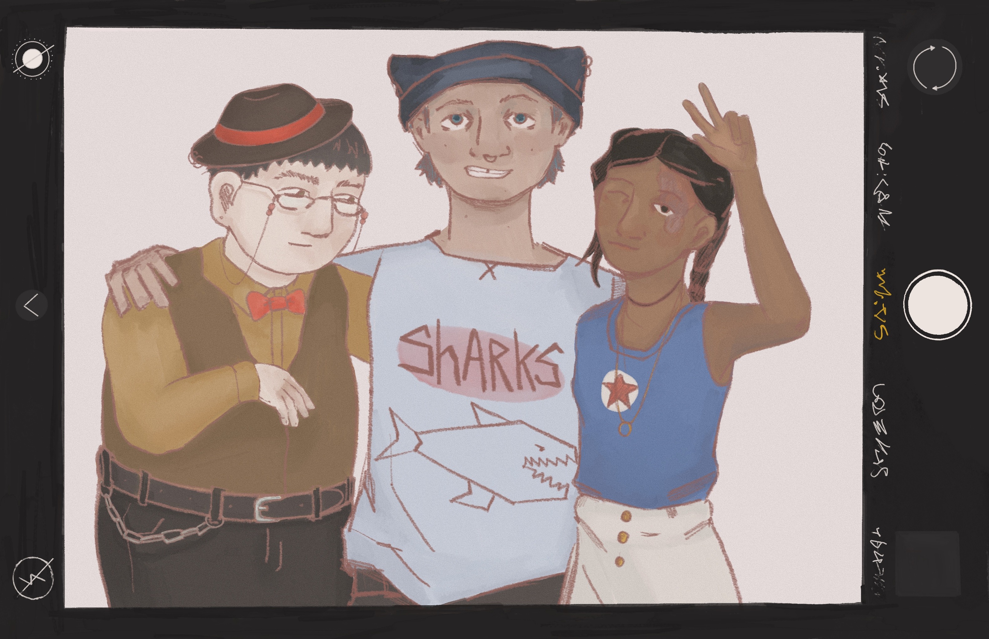 Персона в центре выше всех, смуглые, обнимают людей обеими руками, смотрят в камеру и улыбаются, показывая зубы. У них голубые глаза и короткие светлые волосы, в носу пирсинг-колечко. На них синяя шапка с кошачьими ушами и голубая футболка с рисунком акулы и надписью SHARKS.