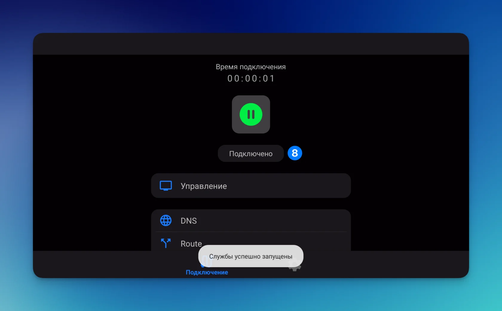8️⃣ Кнопка станет зеленой и изменит статус на «Подключено». Также увидите надпись «Службы успешно запущены».