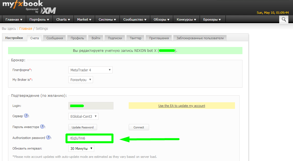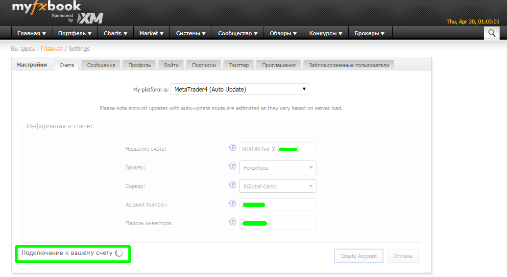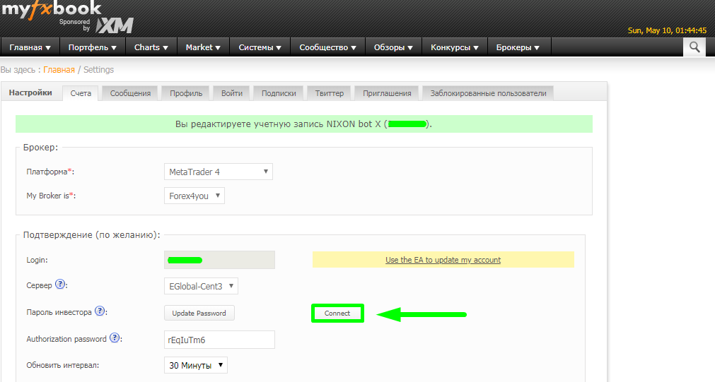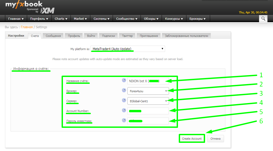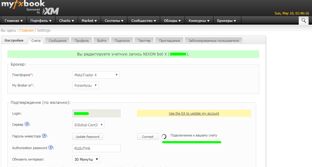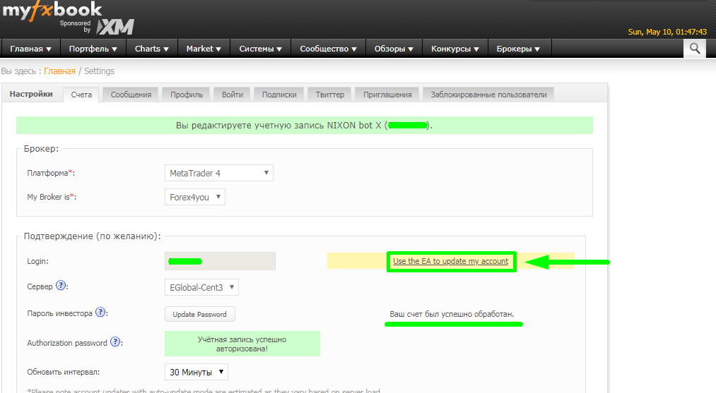 3 Meta Trader4 (Auto Update) - MyFxBook сам подключается к счету по инвесторскому паролю