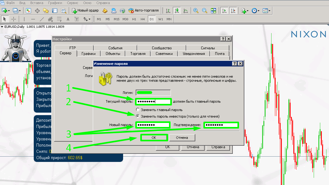 Ставите галочку на «Заменить пароля инвестора» (2)