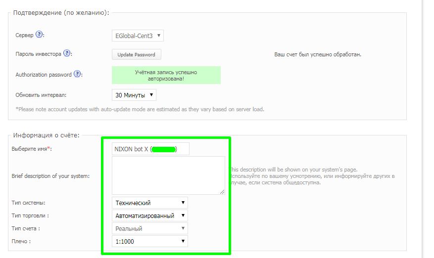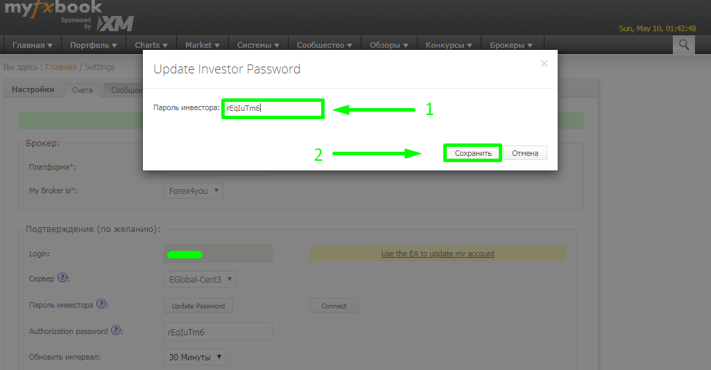 В колонке «Пароль инвестора» набираете сгенерированный системой myfxbook пароль инвестора (1)