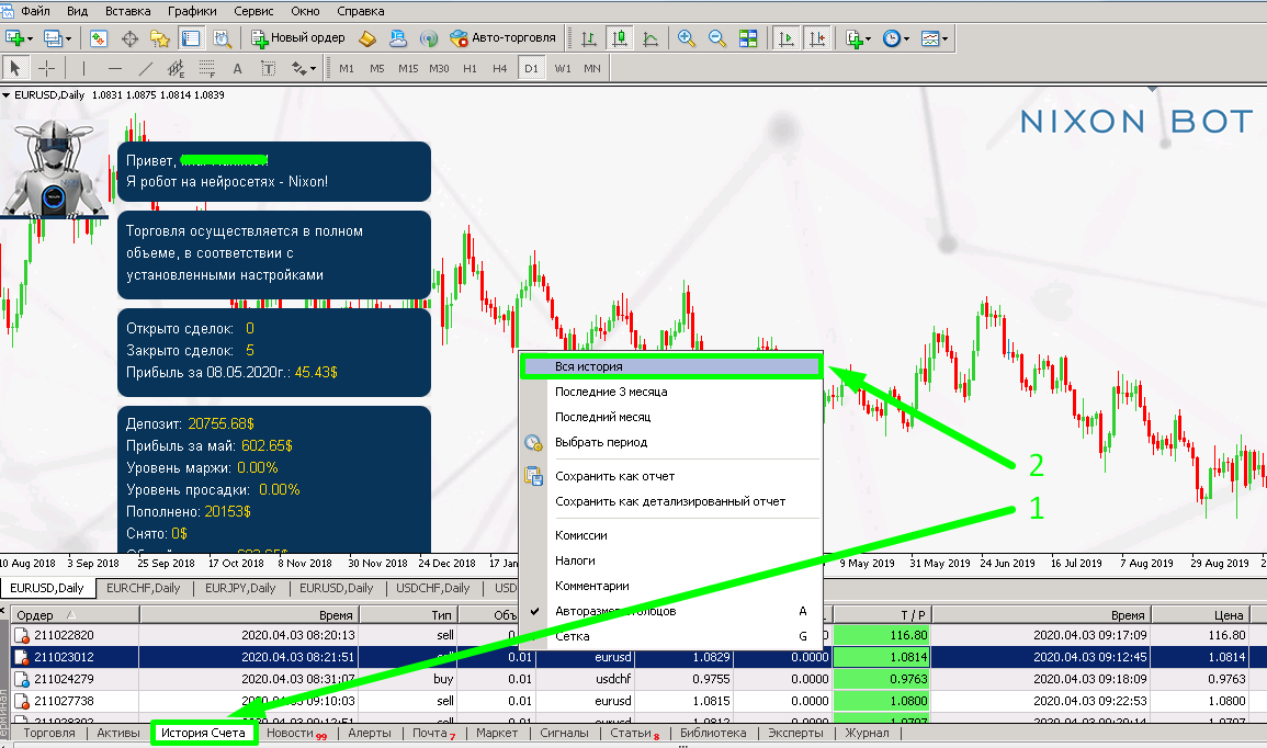 Перед изменением пароля инвестора, рекомендуем в терминале (Ctrl+T окно терминала) во вкладке «История Счёта» (1) выбрать период «Вся история» (2) для того, чтобы MyFxBook смог считать всю историю торговли