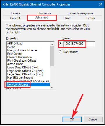 3.В окне «Свойства» на вкладке «Дополнительно» выбери «Сетевой Адрес» в списке свойств. Если этот параметр не отображается, сетевой драйвер не поддерживает эту функцию.4.Включи параметр «Значение» и введи требуемый MAC-адрес без разделителей —не используй дефисы или двоеточия. Нажми кнопку «OK».