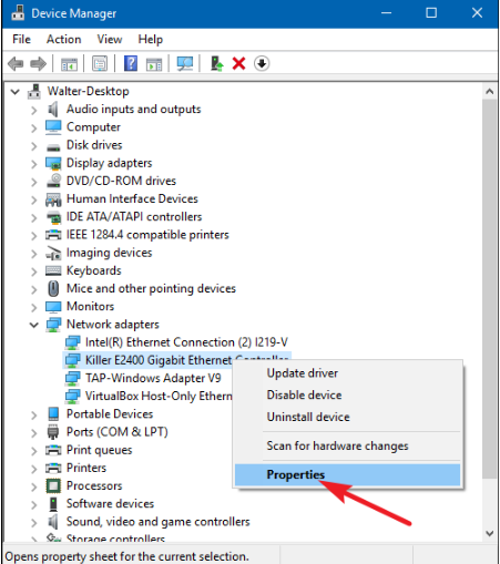 2.В диспетчере устройств в разделе «Сетевые адаптеры» щелкни правой кнопкой мыши по сетевому интерфейсу, который хочешь изменить, и выбери в контекстном менюпункт «Свойства».