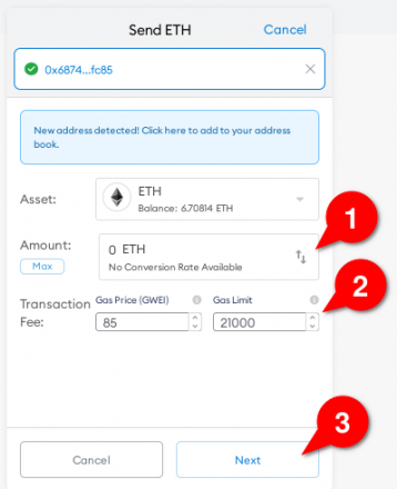 2. Вводим сумму ETH или другую криптовалюту, которую хотим отправить, сумму комиссии оставляем стандартную.