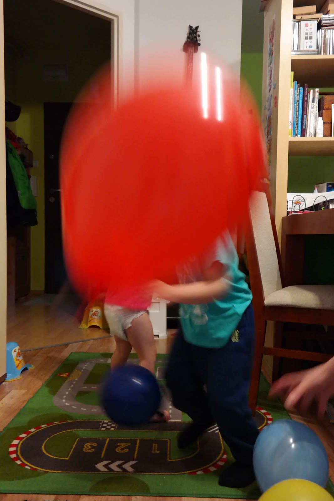 Na przerwę w muzyce podnosiły baloniki i przytrzymywały je między głowami, brzuszkami, kolankami itp . Dzieci ćwiczyły podrzucanie i łapanie, celowały do kosza, umieszczały balony w górę, w dół i w bok, odbijały je oraz toczyły po całej sali, chodząc na czworakach .