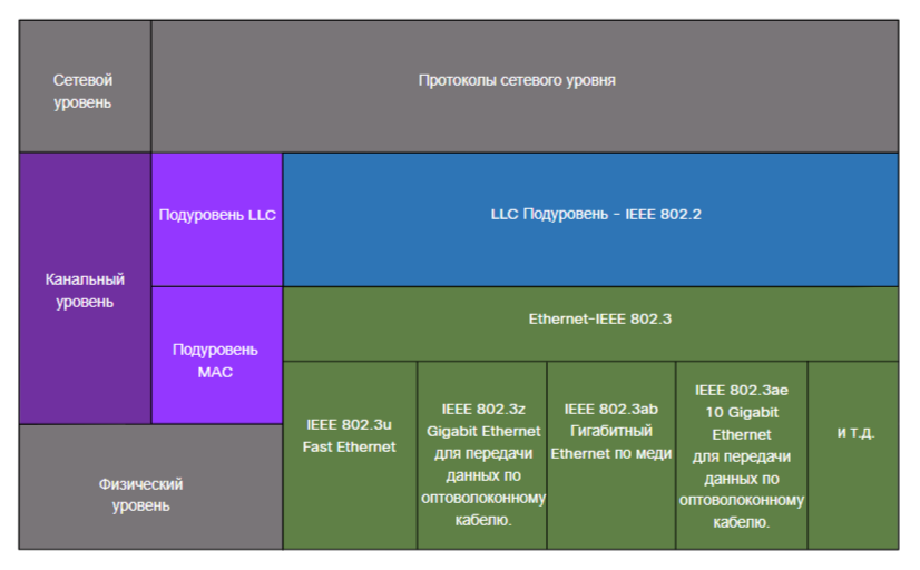 Рисунок показывает различные стандарты Ethernet в подуровне MAC. В верхней части диаграммы находится сетевой уровень и протокол сетевого уровня. Ниже находится уровень канала передачи данных и его подуровни. Верхним подуровнем является подуровень IEEE 802.2 LLC. Далее идет подуровень Ethernet IEEE 802.3 MAC. Ниже приведены пять столбцов с различными стандартами Ethernet и типами сред передачи данных, которые охватывают нижнюю часть подуровня MAC и весь физический уровень OSI. Слева направо столбцы: IEEE 802.3u Fast Ethernet; IEEE 802.3z Gigabit Ethernet по оптоволокну; IEEE 802.ab Gigabit Ethernet по меди; IEEE 802.3ae 10 Gigabit Ethernet по оптоволокну; и так далее.