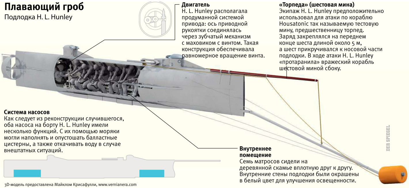 Восемь членов экипажа сидели в трубе диаметром 1,2 м. При тусклом свете свечей они теснились на низкой скамье рядом. Лодка приводилась в движение вручную при помощи своего рода коленчатого вала. Экипаж вращал его в положении сидя, удерживая лодку в состоянии равновесия. Моряки должны были понимать, что их служба в столь жутких условиях напоминала миссию команд смертников. Ведь испытательные погружения стоили жизни членам двух экипажей, с том числе и изобретателю лодки Хорасу (Горацио) Лоусону Ханли. И тем не менее находились добровольцы, готовые участвовать в этой авантюре. Во времена Дикого Запада подлодка считалась символом самых передовых технологий.