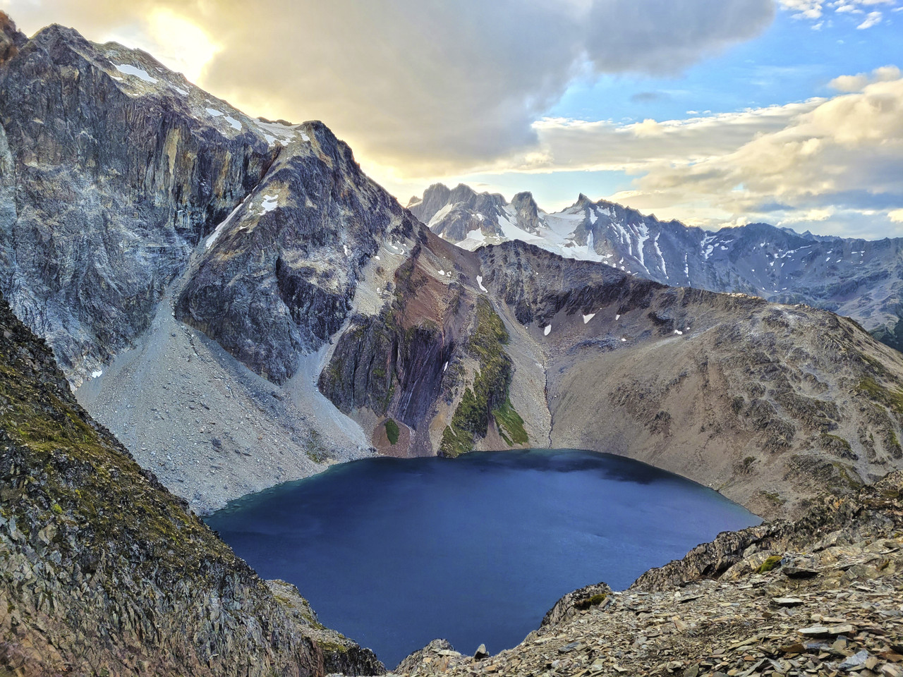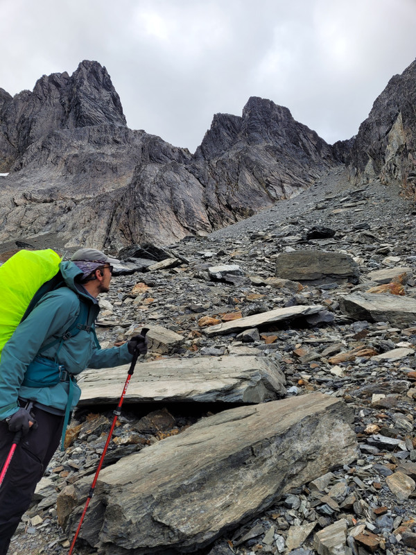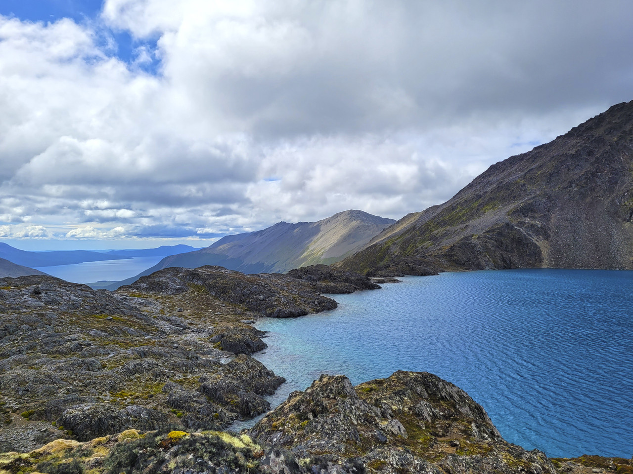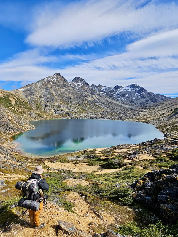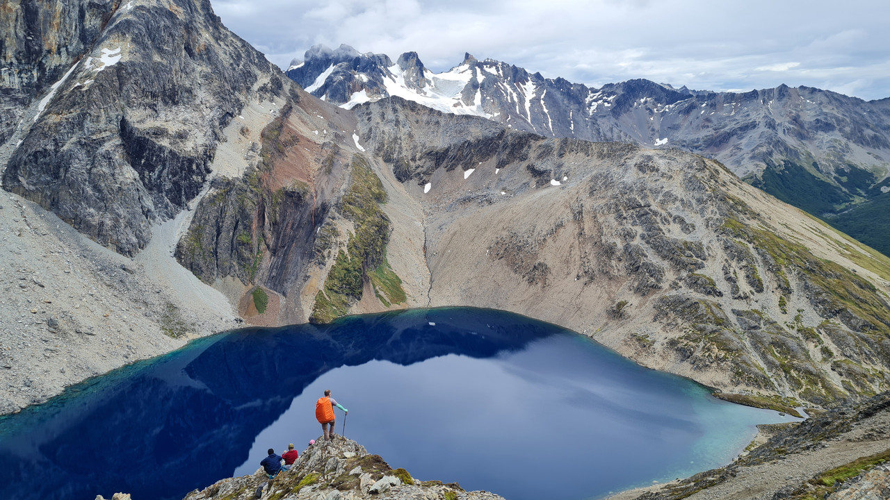 После перевала мы оказываемся за водоразделом, на северной части массива, той самой дикой, без дорог и популярных туристических троп. Идем траверсом по ущелью с видом на бывший фьорд - озеро Фагнано. Поднимаемся к горным лагунам Асуль и Верде, где ночуем в закрытой от ветра местности.