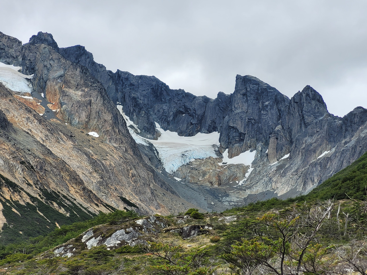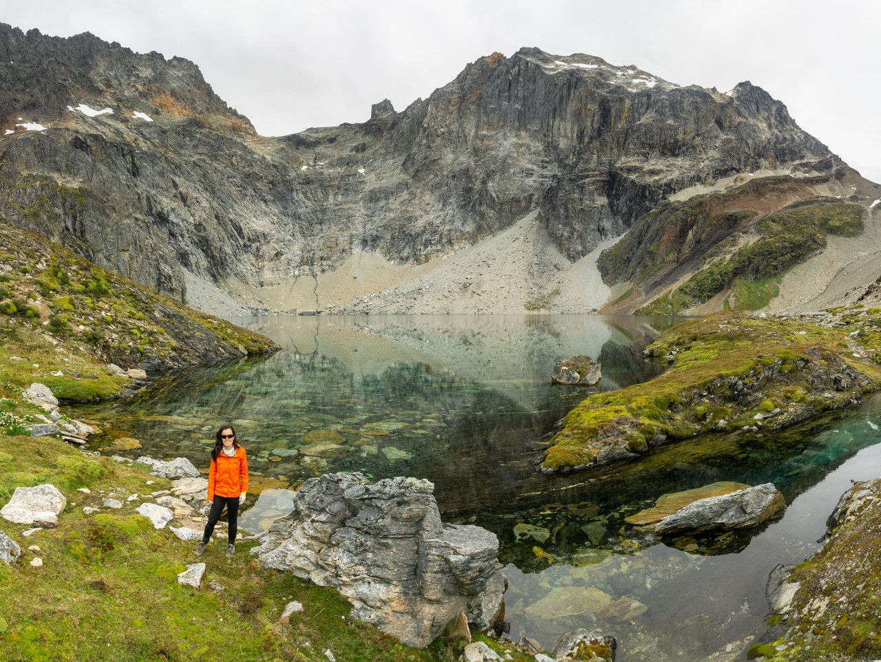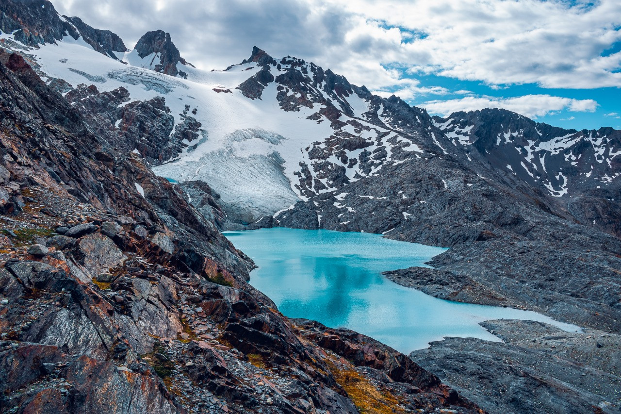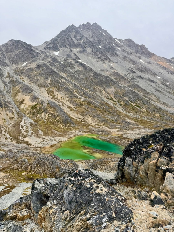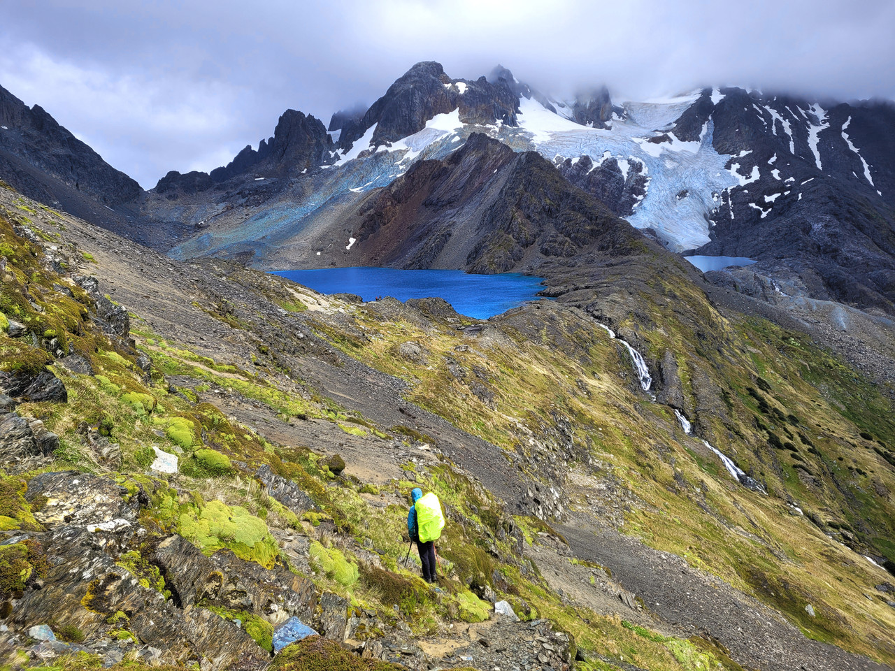 После перевала мы оказываемся за водоразделом, на северной части массива, той самой дикой, без дорог и популярных туристических троп. Идем траверсом по ущелью с видом на бывший фьорд - озеро Фагнано. Поднимаемся к горным лагунам Асуль и Верде, где ночуем в закрытой от ветра местности.
