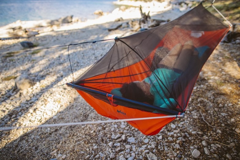 В отдельную категорию я бы хотел вывести гамаки. Вещь на любителя, поэтому однозначно стоит попробовать. Тут, конечно, без всяких приспособлений под разные условия не обошлось. Защита от насекомых — есть сетчатые балдахины, защита от холода — надувные коврики, либо же андерквилт, это спальник, пристегивающийся к гамаку снизу, благодаря этому утеплитель не сжимается и продолжает хранить ваше тепло.