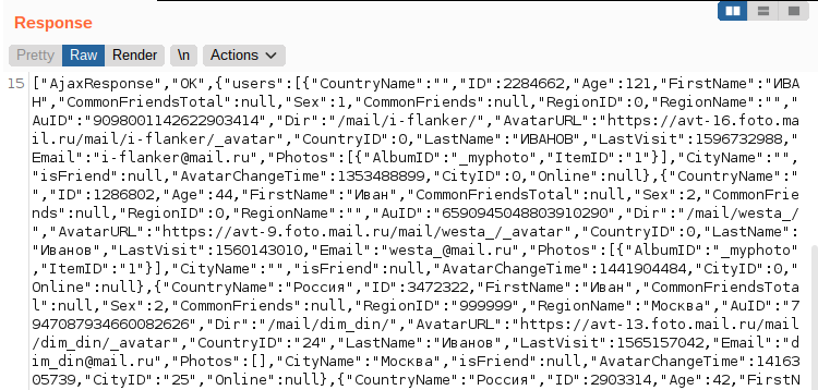 С параметрами, в принципе все понятно: из имени параметра следует его смысл. В ответе кроме привычных значений присутствуют интересные числовые поля ID и AuID, можно было бы подробней изучить другие ресурсы mail.ru на возможность их применения. По лимитам получились такие выводы: