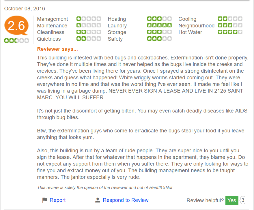 Не лишним будет пробивать адрес дома в Google с припиской «Should I rent» («стоит ли мне снимать»). На проблемные адреса, особенно зараженные клопами, выдаются сразу негативные отзывы и адрес выбрасывается из рассмотрения еще до звонка. Вот, например, по этому объявлению не скажешь, что все плохо с домом: https://www.padmapper.com/buildings/p214744/la-citadelle-apartments-at-2125-rue-saint-marc-montreal-qc-h3h-2p1