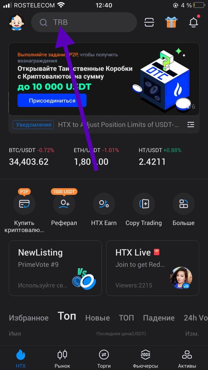 1) Заходим на биржу HTX, и нажимаем на поиск.