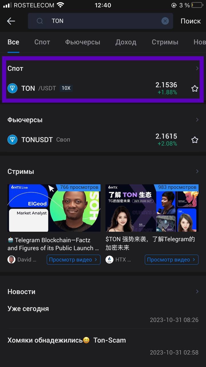 2) В поиске пишем TON и нажимаем на спотовую пару TON/USDT.
