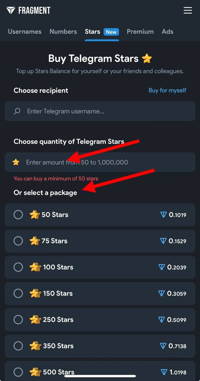 Покупка Telegram Stars через Fragment