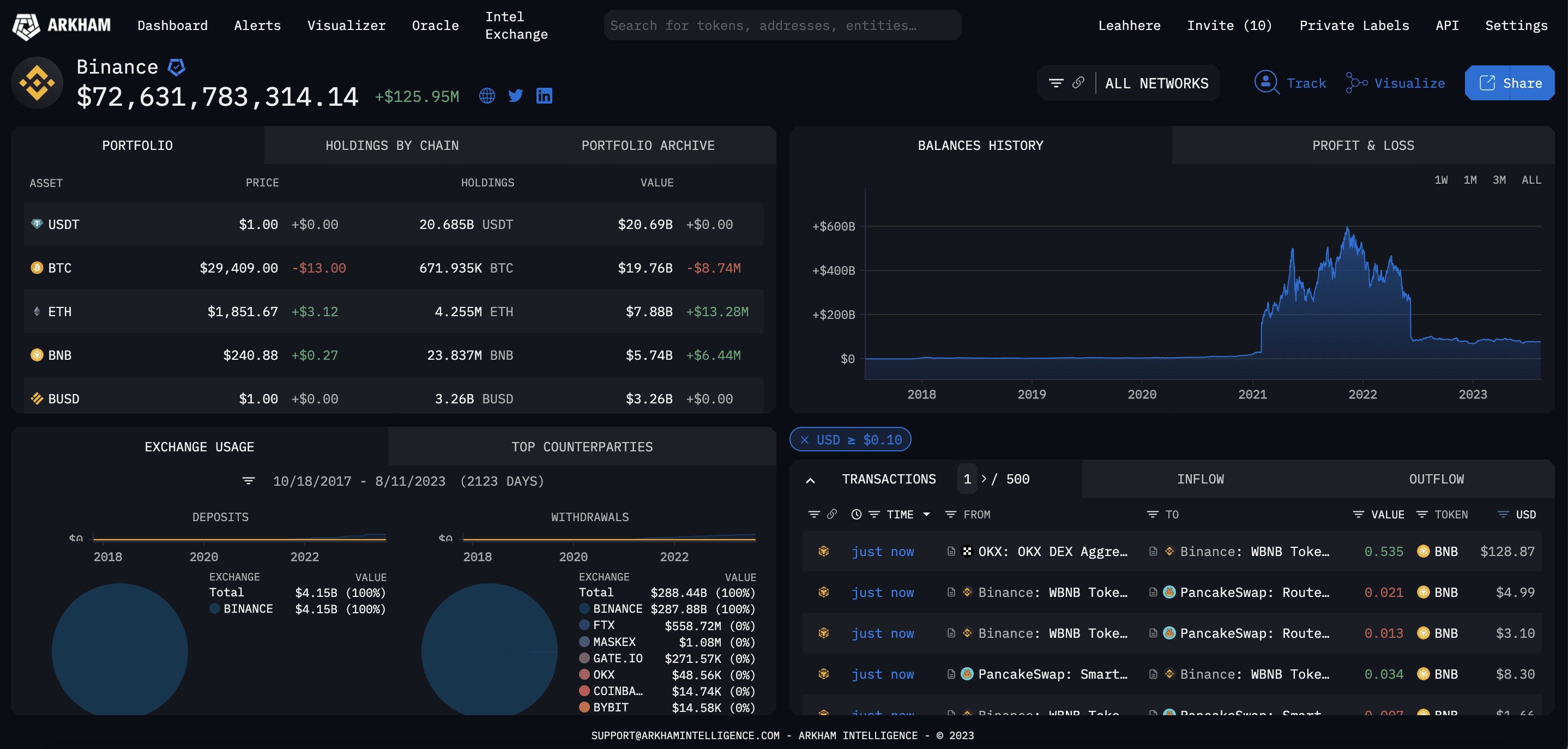 Например мы можем искать информацию, связанную с Binance, такую как: общий объем имеющихся активов, история баланса, совершенные транзакции, партнеры и т. д.