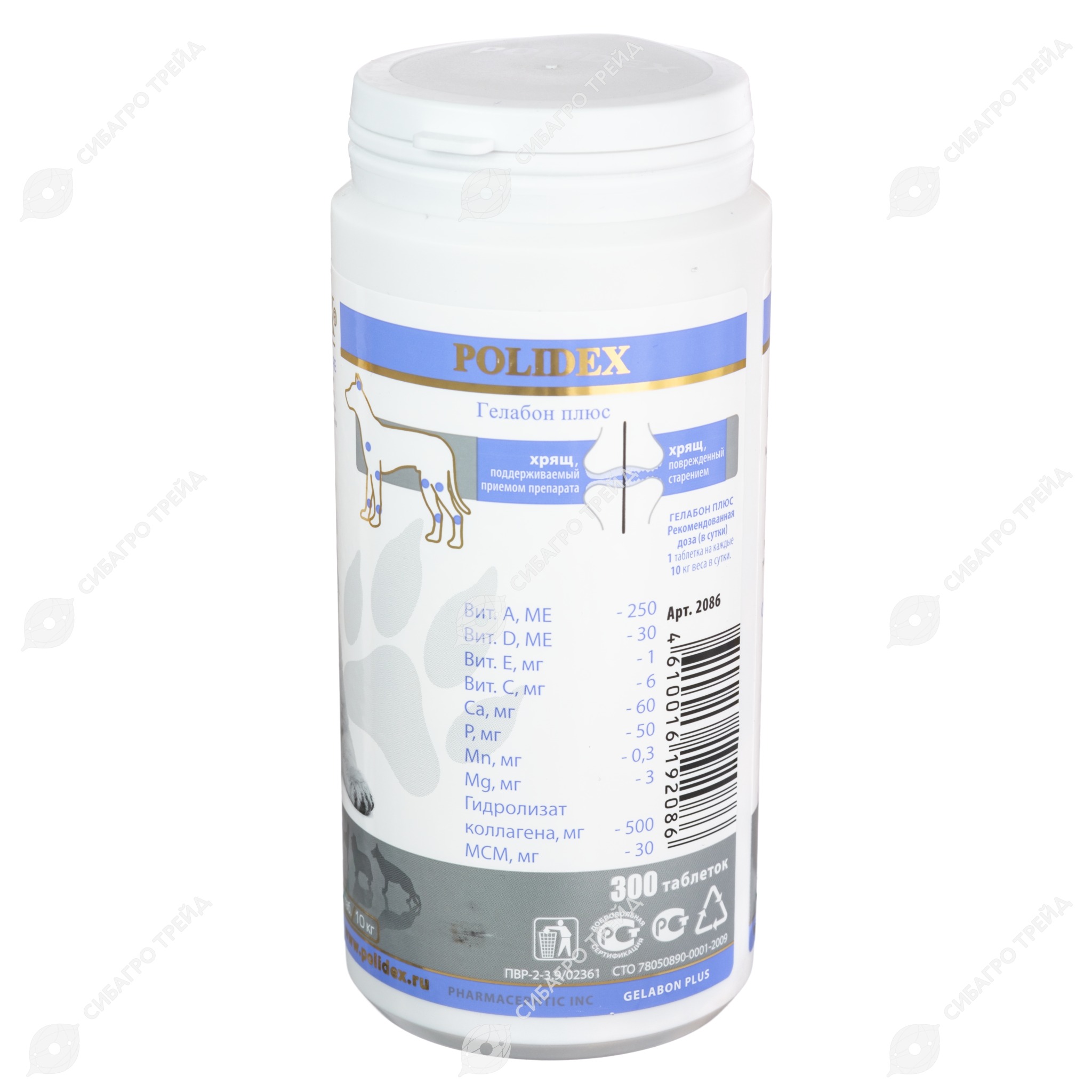 ПОЛИДЕКС Гелабон плюс POLIDEX GELABON PLUS, для собак (1 таб/10 кг, 300 табл) «Гелабон плюс» предназначен для эффективной профилактики заболеваний хрящевых поверхностей суставов, связок . Необходим щенкам в период роста и при нагрузках . Способствует восстановлению суставов и связок при повреждениях . Основными компонентами препарата являются: