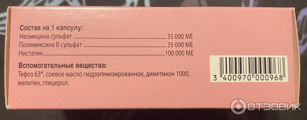 Прочие ингредиенты: диметикон 1000, тефоз® 63 (макрогол 300 и 1500 и этиленгликоля стеарат), масло соевое гидрогенизированное, желатин, глицерин, вода очищенная . Капсулы для вагинальных инстилляций, адаптированные для применения у девочек и девушек-подростков .