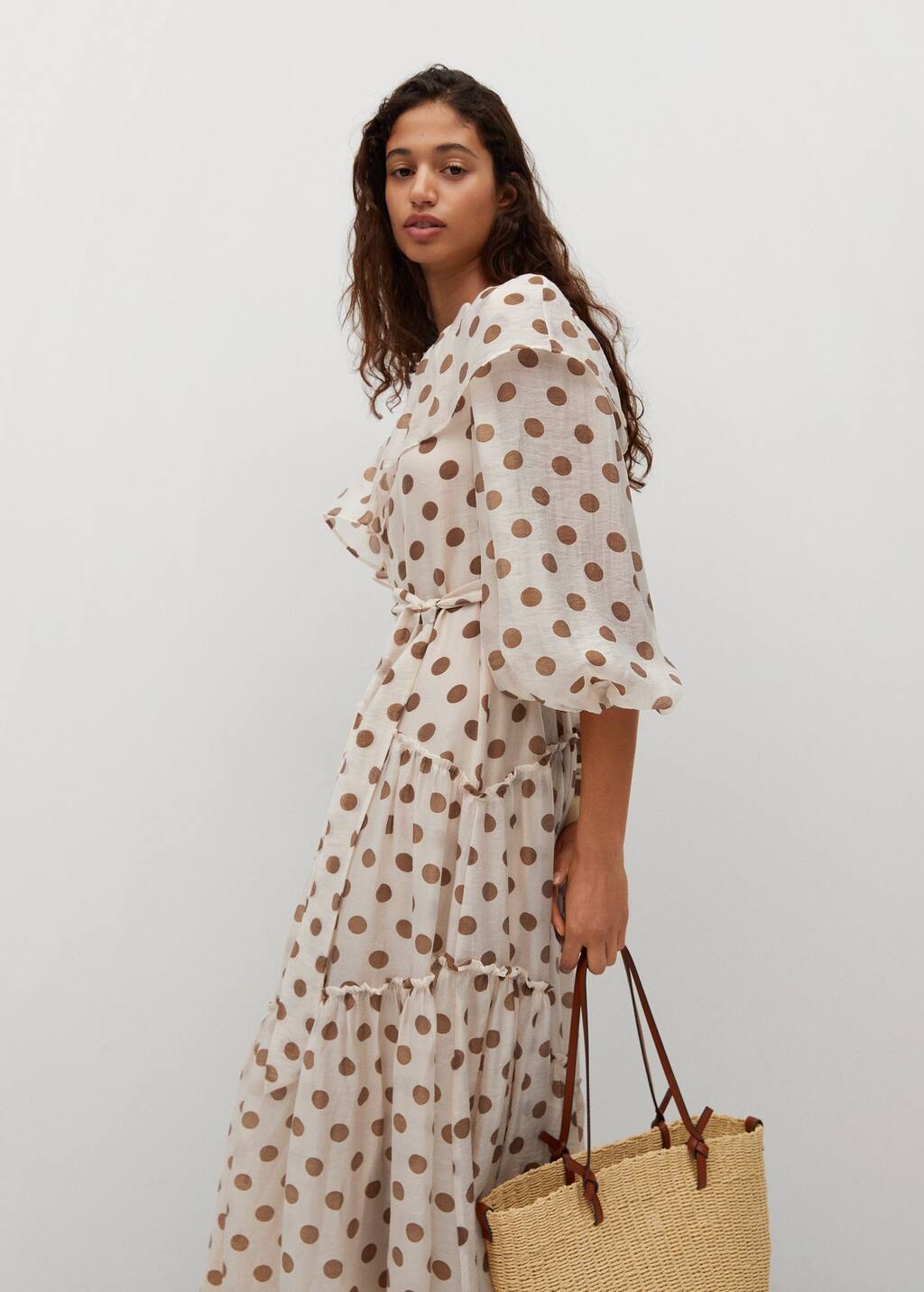 Tahari ASL Polka Dot Faux Wrap Surplice V-Neck Long Puff Sleeve Dress . $138 .00 . KARL LAGERFELD PARIS Polka Dot Print Chiffon Tiered Midi Dress . $138 .00 . Adrianna Papell V-Neck 3/4 Sleeve Metallic Dot Faux Wrap Midi Dress .