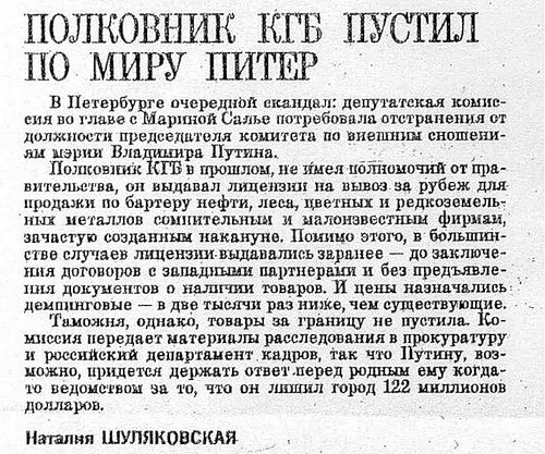В статье Наталии Шуляковской «Полковник КГБ пустил по миру Питер» рассказывалось о требовании комиссии из депутатов местного законодательного собрания отстранения Путина от занимаемой им в то время должности в связи с коррупцией[14][15] .