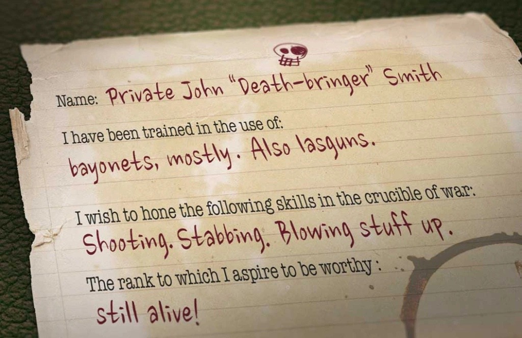 Страница 2: Укажите имена своих боевых товарищей. Используйте идущий в комплекте с дневником набор стикеров, чтобы отметить как принявших мученическую смерть на полях боёв, так и казнённых за постыдное проявление трусости и предательства; клейкими золотыми звёздами из набора следует отмечать проявления вашими однополчанами исключительного героизма.