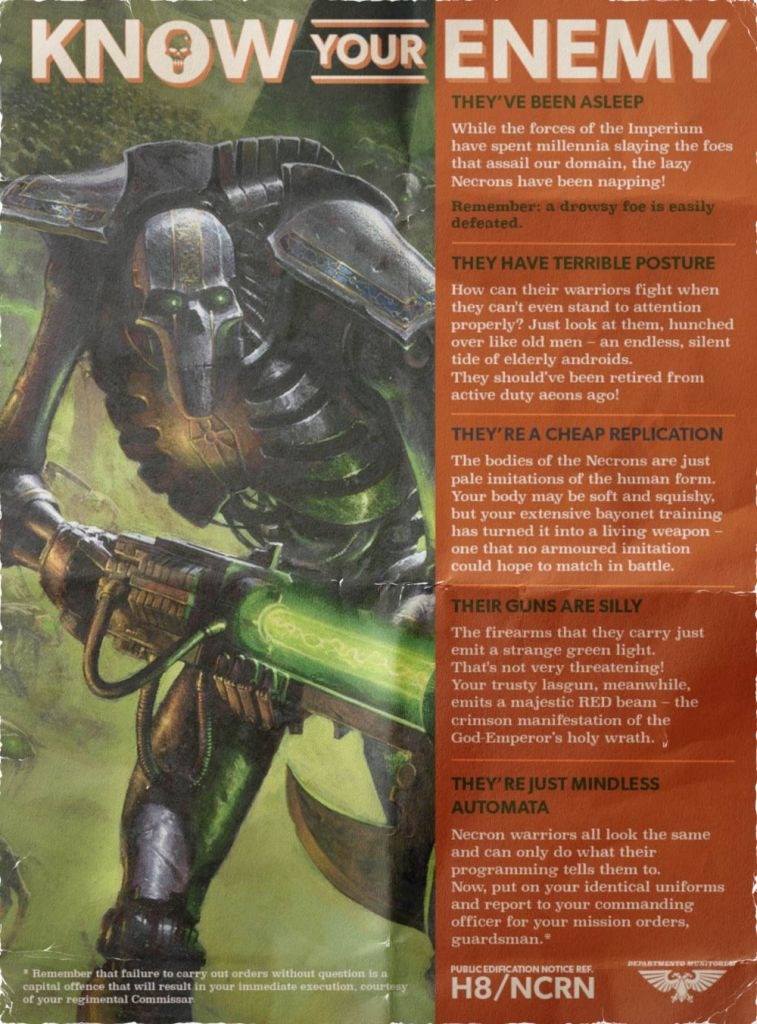 У нас для вас вдохновляющие новости — знатоки из Высшего Командования всё это время не покладая рук изучали некронскую угрозу по всему Империуму, в особенности в суб-секторе Нефилим. Хорошие новости заключаются в том, что результатом их изысканий стал неоспоримый вывод — эта раса механоидов уступает вам, обычным гвардейцам, по всем параметрам!