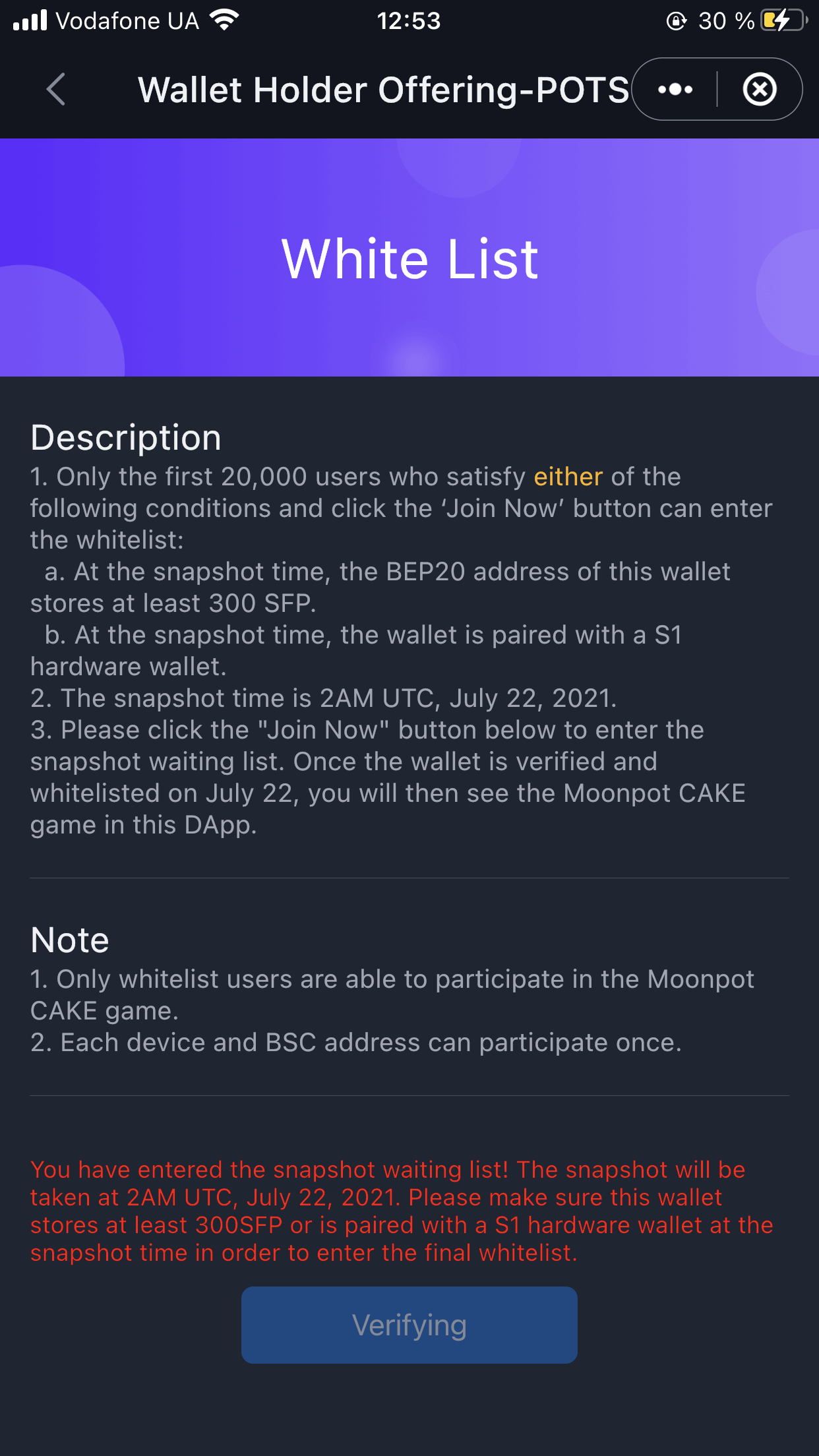 Снимок произойдет 22го июля, так что нам нужно держать наши монеты SFP до этого момента.