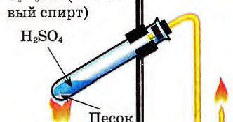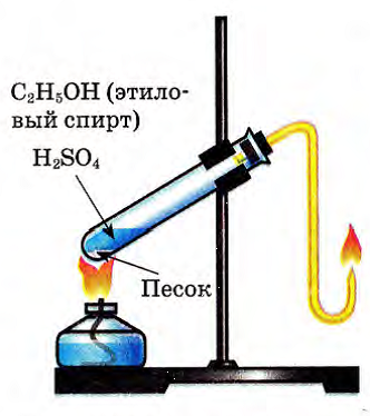 Получение этилена дегидратацией этанола над твердым катализатором . Другая U-образная трубка (3) заполняется спиртом или водой для получения раствора этилена .