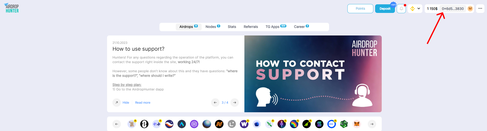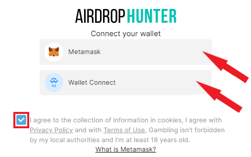 - Переходим на сайт AirdropHunter и подключаем MetaMask-кошелёк (в правом верхнем углу):