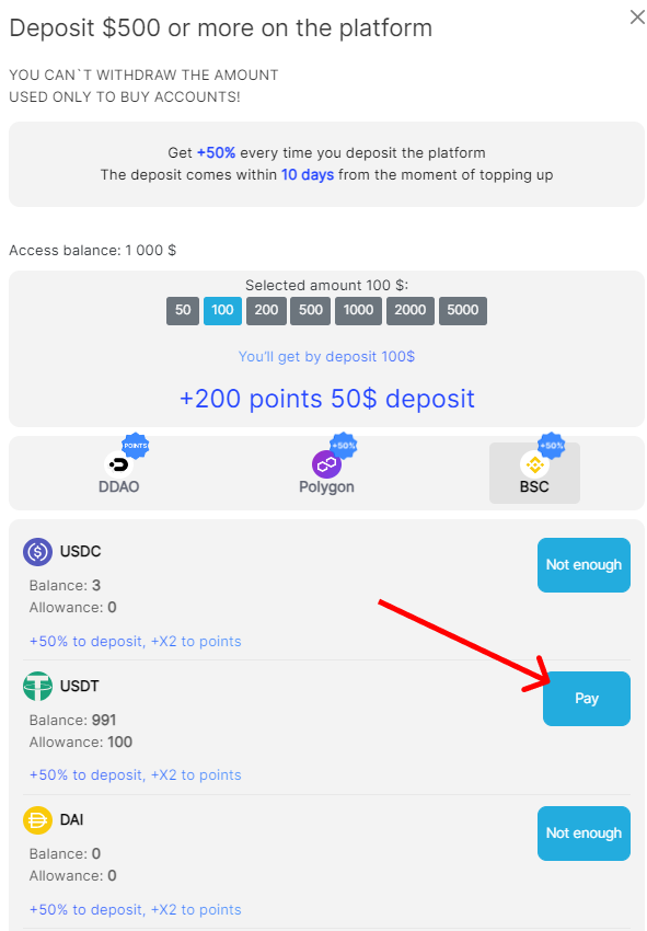 Теперь на строчке с Allowance у нас отобразится сумма $100 - жмём "Pay" и пополняем платформу: