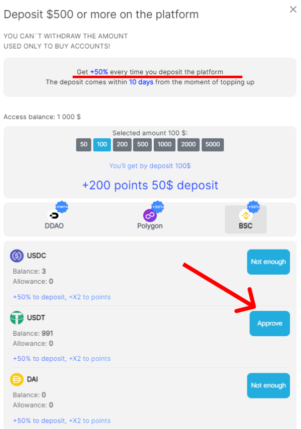3. Для получения первого бонуса +50% на депозит, мы нажимаем "Deposit" и пополняем платформу на любую сумму (к примеру 100$) для крупного мультипликатора в любом из перечисленных стейблкойнов: USDT, USDC или DAI. (в сети Polygon или BSC):