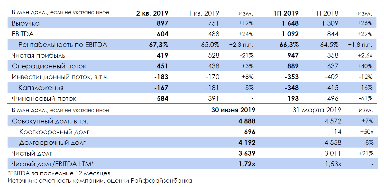 Крупнейший российский производитель золота Polyus (ВВ/Ba1/BB) опубликовал финансовые результаты за 2 кв. 2019 г. по МСФО. С одной стороны, повысились и выручка (+19% кв./кв. до 897 млн долл.), и EBITDA (+24% кв./кв. до 604 млн долл.) на фоне увеличения объемов производства при тех же ценах на золото, что и кварталом ранее, и рентабельность по EBITDA достигла рекордного для компании уровня 67,3% на фоне снижения общих денежных издержек (TCC). Но, с другой стороны, долговая нагрузка вернулась к 1,7х Чистый долг/EBITDA с 1,5х из-за экспирации валютного свопа, по которому убыток составил 472 млн долл. (разовый убыток, который был более чем компенсирован за период действия ростом EBITDA из-за девальвации рубля), а также из-за выплаты дивидендов за 2П 2018 г. (295 млн долл.).