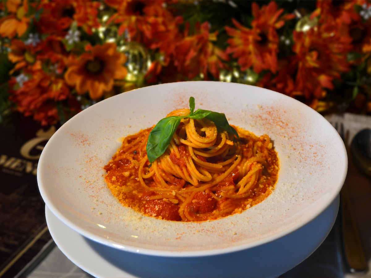 орячие спагетти, вяленые с травами и чесноком помидоры, острый и терпкий вкус горгонзоллы дополняют друг друга просто фантастически . Попробуйте, это