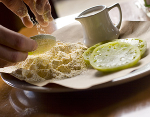 Рецепт приготовления ломтиков зеленых помидоров в кляре из пшеничной муки, кукурузной муки, молока и яиц, обжаренных в жире бекона . Жир бекона придает этой закуске дымчатый привкус .