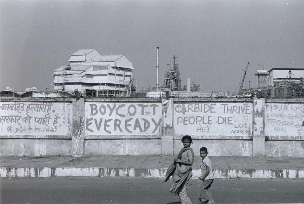 В полночь 2 декабря 1984 года произошла утечка газа метилизоцианата из работающего завода по производству пестицидов американской транснациональной компании Union Carbide Corporation (UCC), в результате чего только в первые три дня погибло более 8000 человек; в течение следующих двух десятилетий умерло еще 25 000 человек и более 150 000 остались с хроническими заболеваниями.