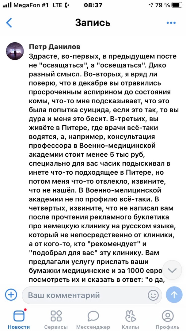Насчет передозировки веществами внесу еще интересную деталь. Це не моя фантазия, не поклеп и не клевета. Вот что пишет Кате Петр Данилов – не левый человек, а чуть ли не пиар-директор Кати.