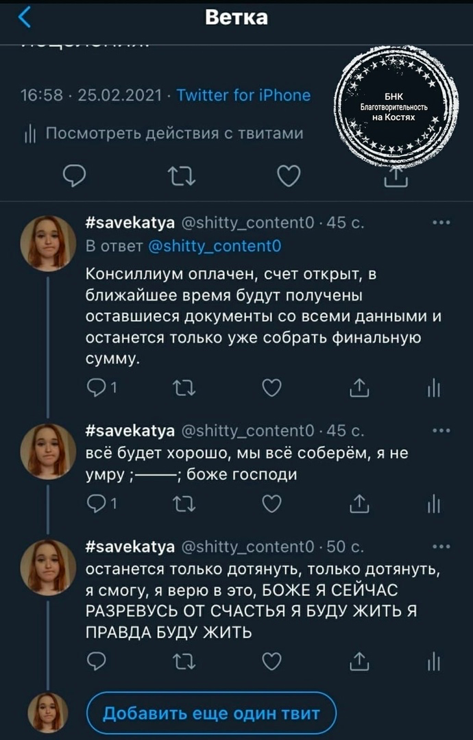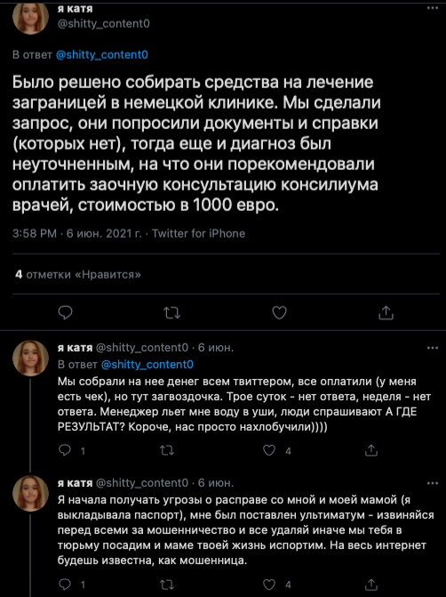 – основанием для сбора была операция и Катю якобы согласилась оперировать только немецкая клиника, но фактически никакого письма от этой клиники Катя не предоставляла, все только на словах.