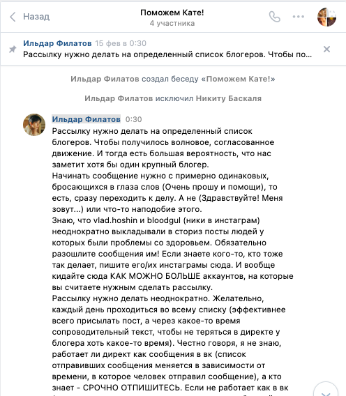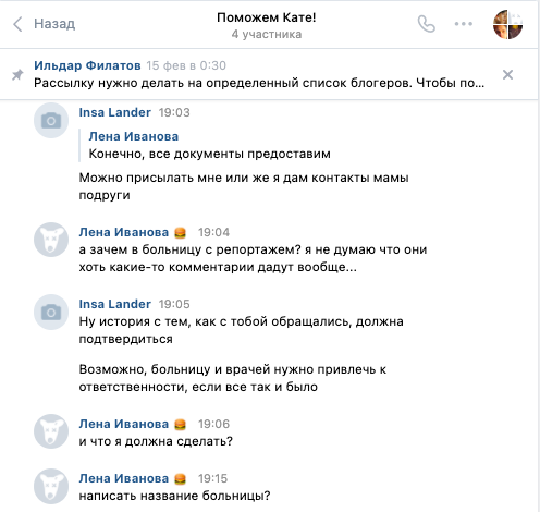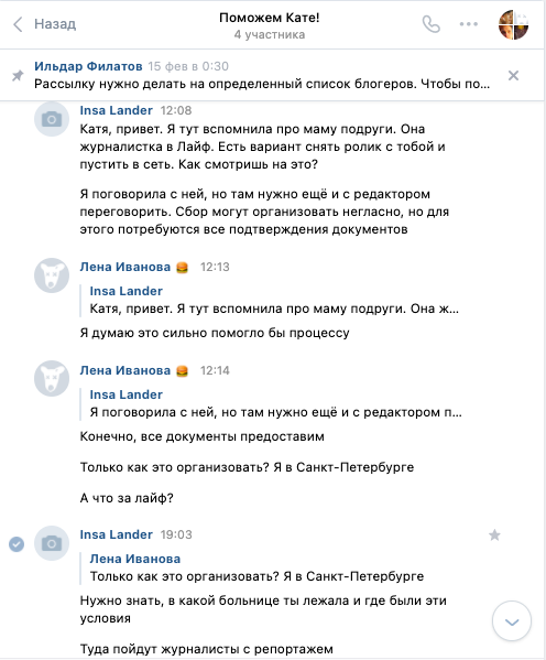 В феврале 2021 я вступила в группу, которая называлась "Поможем Кате". Суть заключалась в том, что сюда добавлялись волонтеры, делавшие рассылку блогерам. Планы были наполеоновские – это сейчас Катя просит скромно на баллоны и хирургический отсасыватель. Раньше речь шла о суммах в сотни тысяч евро.