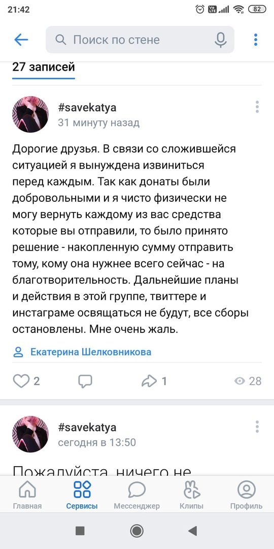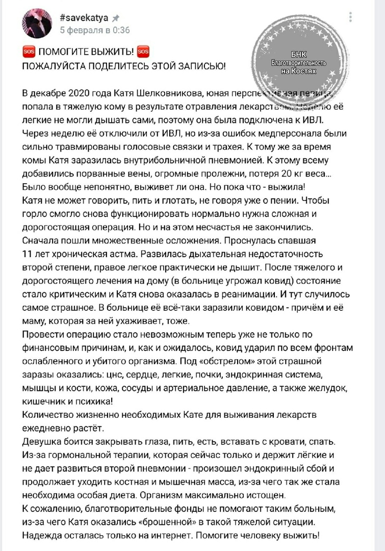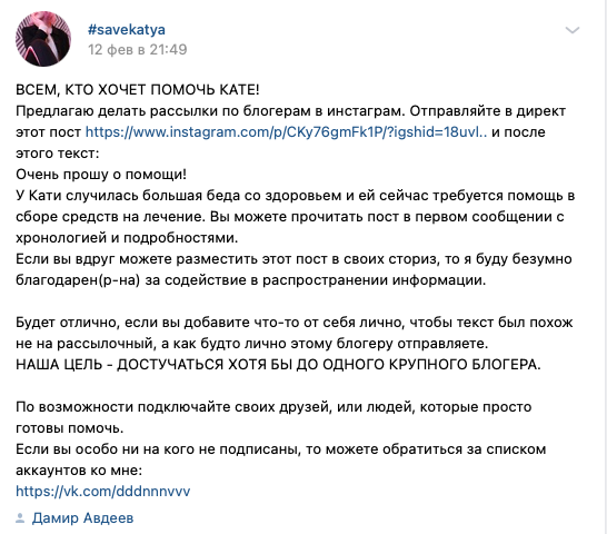 Самый первый ее сбор начался ВК - уже удаленная группа #savekatya