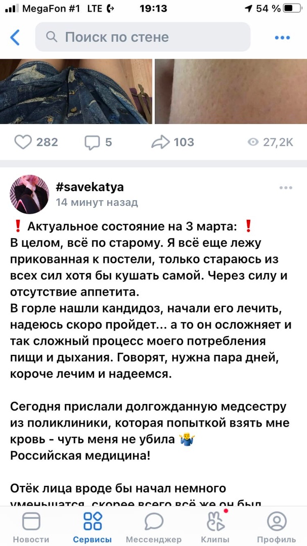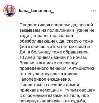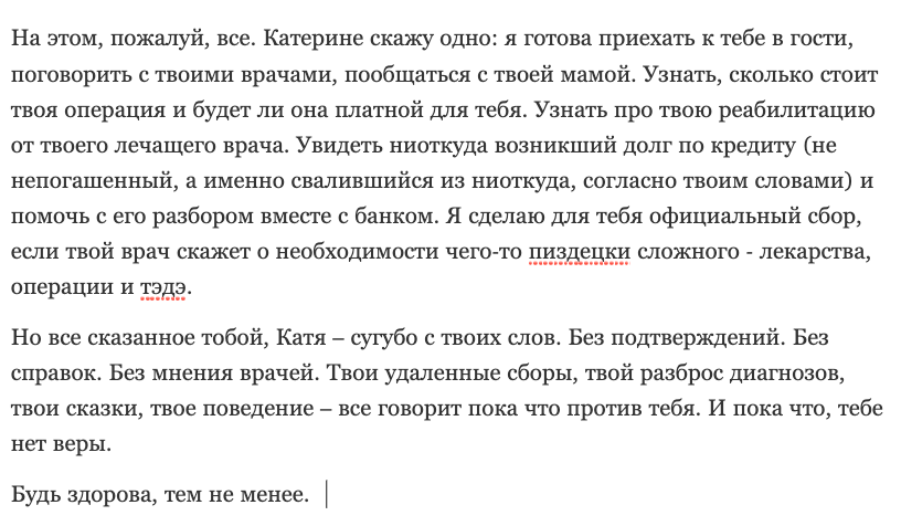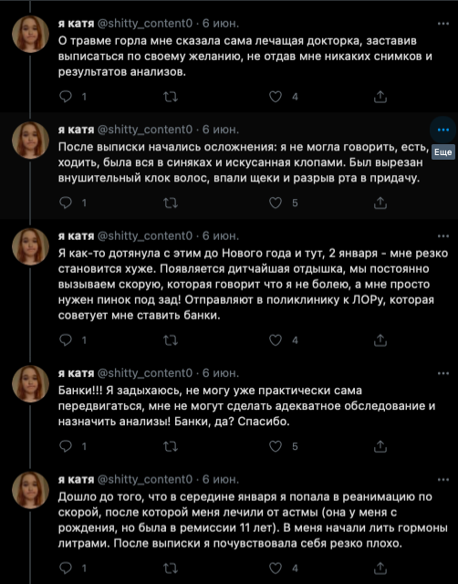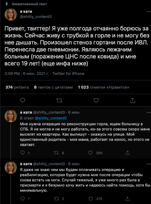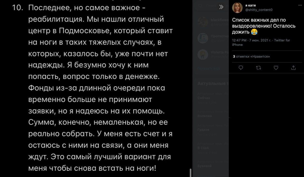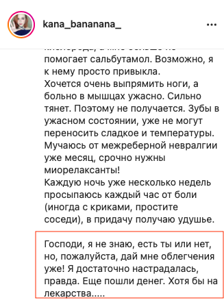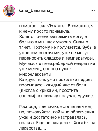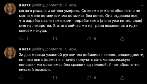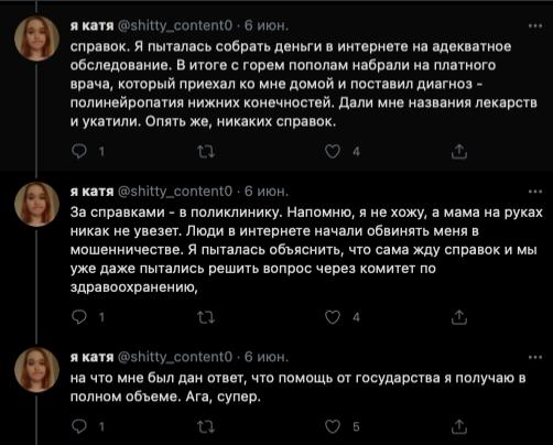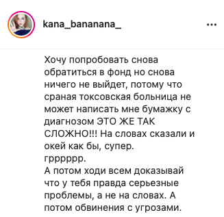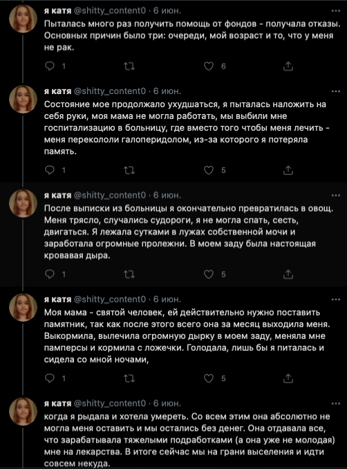 Далее Катя жалуется на то, что ей переборщили с галоперидолом, так как она пыталась наложить на себя руки. Логичность этих событий ее не смущает. Злые фонды не дают денег (скринов переписки с ними не будет), злые врачи снова ебошат галоперидол на пустом месте и Катя теряет память (но не теряет навыки наеба), Катя сутками лежит в лужах мочи после выписки (???) и снова на горизонте возникает проблема денежек.