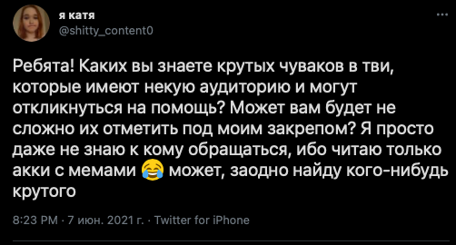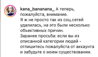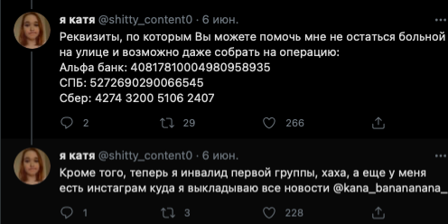 Далее Катя удаляет группу, удаляет свои твиты за февраль, временно удаляет реквизиты с инстаграма и встает в позу: идите нахуй, я вас не знаю, идите нахуй.